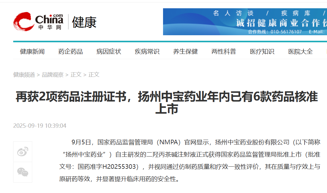 再獲2項藥品注冊證書,揚州中寶藥業(yè)年內已有6款藥品核準上市